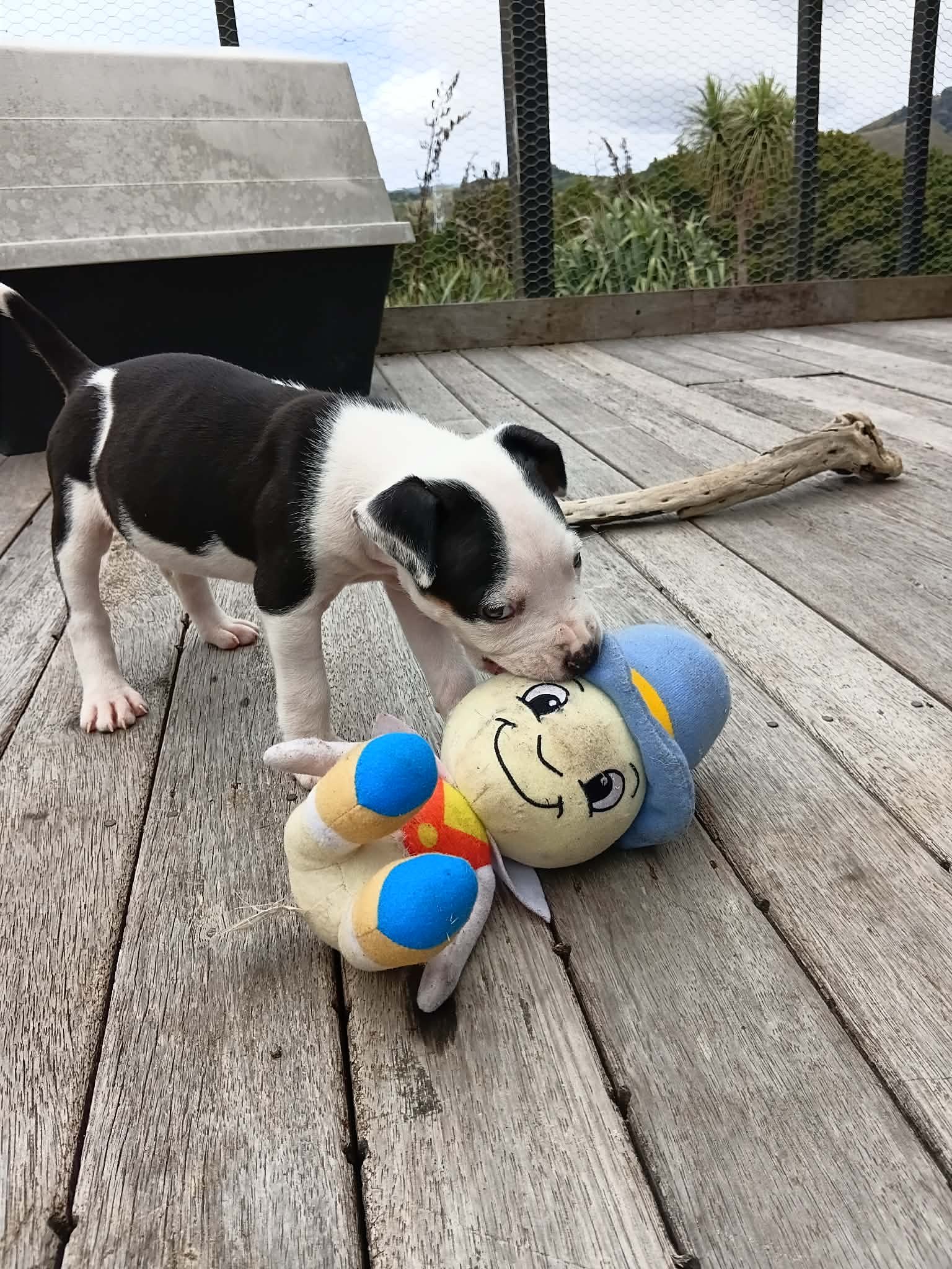 DeeDee D.O.B 13/11/25 DeeDee is a stunning little girl with unique markings. She is full of puppy energy but after play she loves nothing more than snuggling up in your arms and having a snooze. DeeDee doesn’t just run, she dances, bouncing around usually with her favorite toy in her mouth. DeeDee is fostered in Wellsford, being socialized with other dogs and a cat.