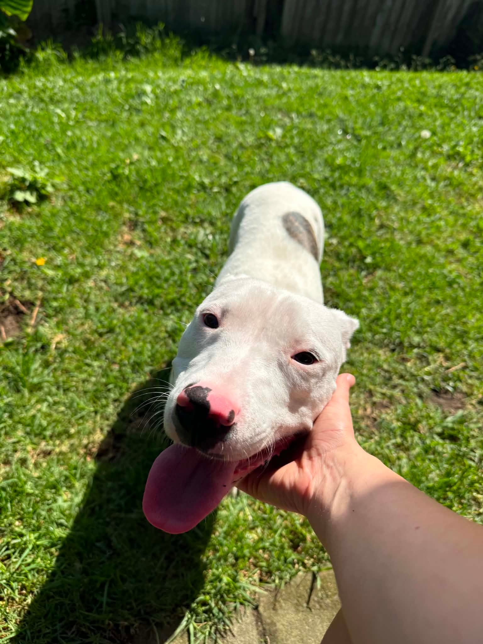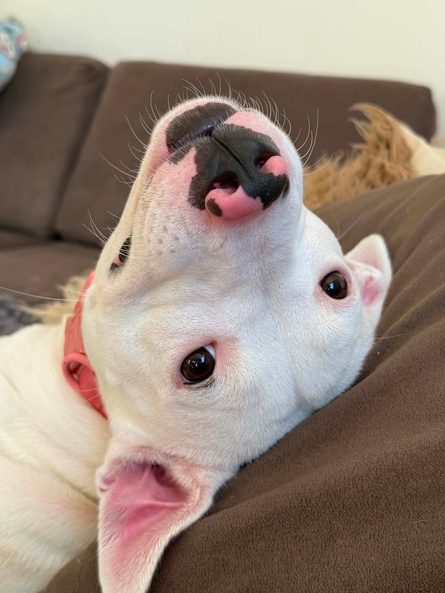 Meet Moo Moo. Moo Moo is a gorgeous young girl, around 1 year old, who is still learning that the world can be a safe and wonderful place. She’s made huge progress in the 4 months she’s been in foster care, but she will need a patient, experienced home to help her continue to grow. She is around 18kgs and we don’t think she’ll get any bigger. Moo Moo would thrive in a home with a confident, friendly resident dog — this is when we truly see her come out of her shell. Having a calm canine role model gives her confidence and reassurance in new situations. She used to be absolutely terrified of the leash, but with lots of love and guidance she actually now really enjoys going on walks on leash. She now knows what leash pressure means so the next thing to work on is a nice heel. She enjoys being on a 10m long line at the park where she can run around safely. Her shyness improves every single day, but she can still be skittish when spooked. Because of this, her new home must have solid, secure fencing and will need adopters who understand that progress isn’t linear and who are happy to go slow. Her foster family are fully invested in her so will be helping out where they can. Moo Moo will likely take a few months to fully settle and feel safe, but those months will be incredibly rewarding. Watching her blossom, gain confidence, and learn to trust is truly special. Her crate is her safe space, and she chooses it when she needs comfort — but once she trusts you, she also loves snuggling on the couch and being close to her people. She will benefit hugely from calm people-watching, routine, and building a strong bond with her human. Moo Moo isn’t a “plug and play” dog — but for the right home, she will be a deeply rewarding companion with so much love to give. Fostered in Glenfield.