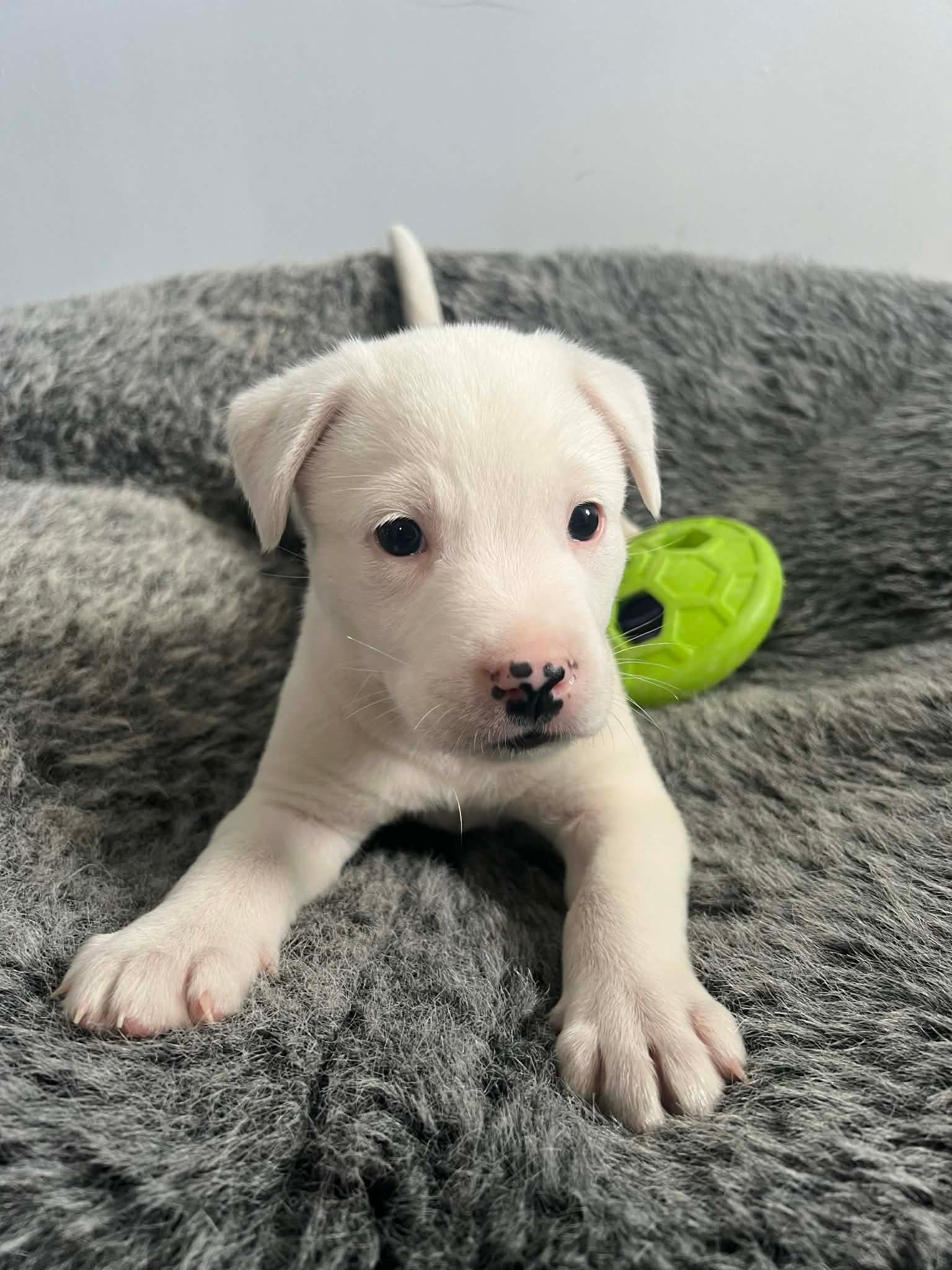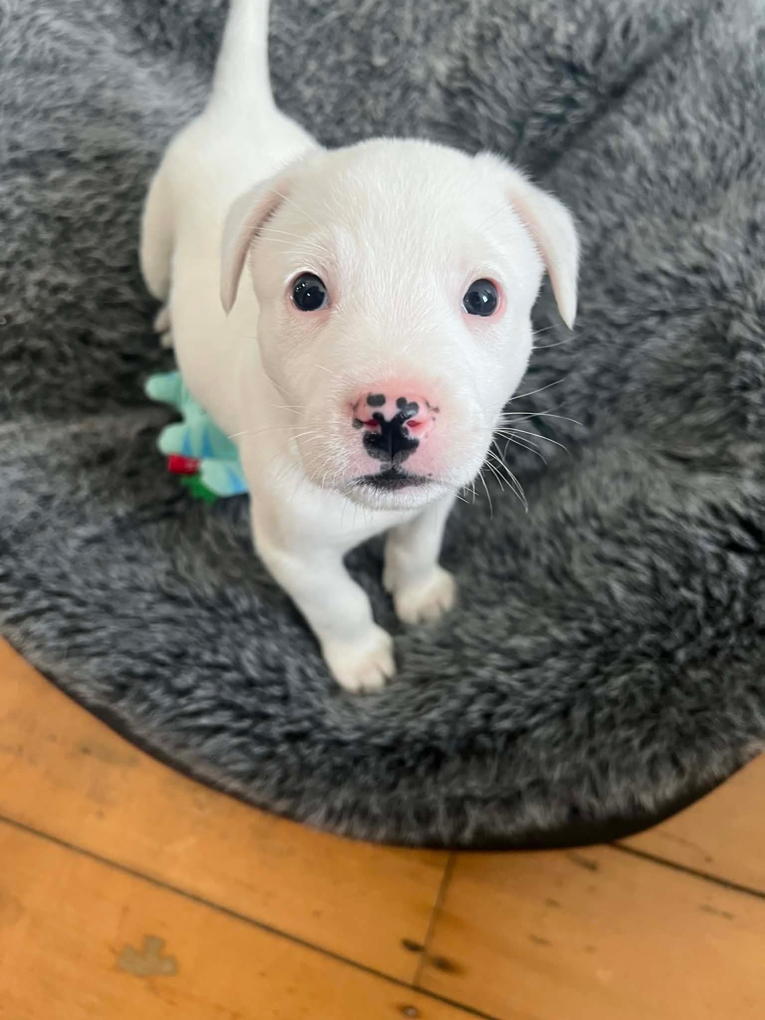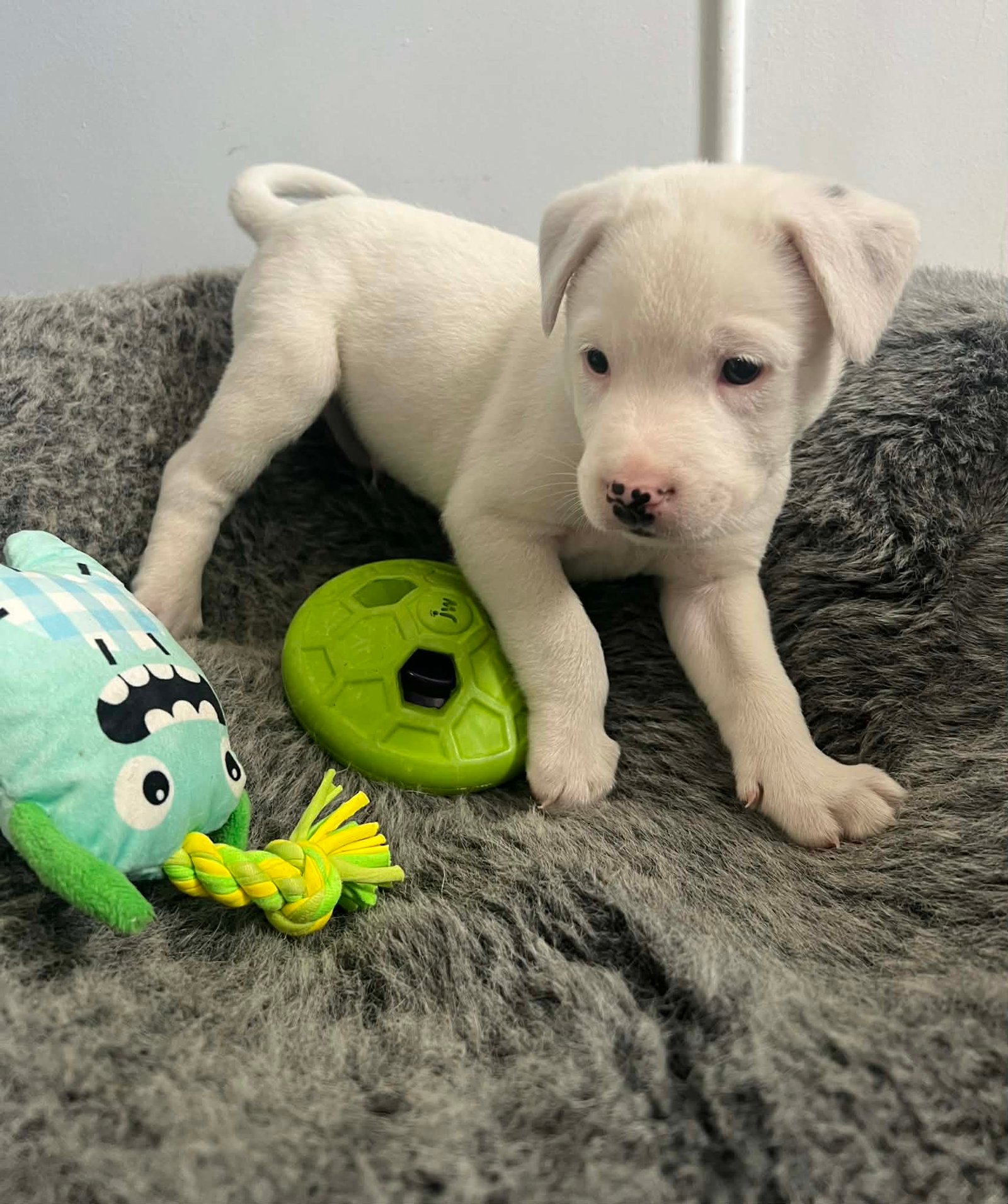 Saint is a gorgeous, goofy boy with confidence and polka dots starting to pop up on his ears and through his coat. He struts around with his tail up high and loves with his whole heart – you can see it in all of his expressions and attempts to play. Born 22/12/25 and fostered in Waiuku, Saint is a loving mixed breed boy with a very expressive face. Saint loves his cuddles and loves other dogs – he is well socialised with our four dogs. Toilet training has started and will be completed by his forever family. He sleeps peacefully all night and has been in an open crate with his brother Niklaus. Saint is a true joy to foster and will be a beautiful best friend to his forever family. His first and second vaccination, microchip and de-sexing are all covered by Saving Hope under the adoption process. Pop in an application to chat and arrange a no obligation to adopt meet and greet.
